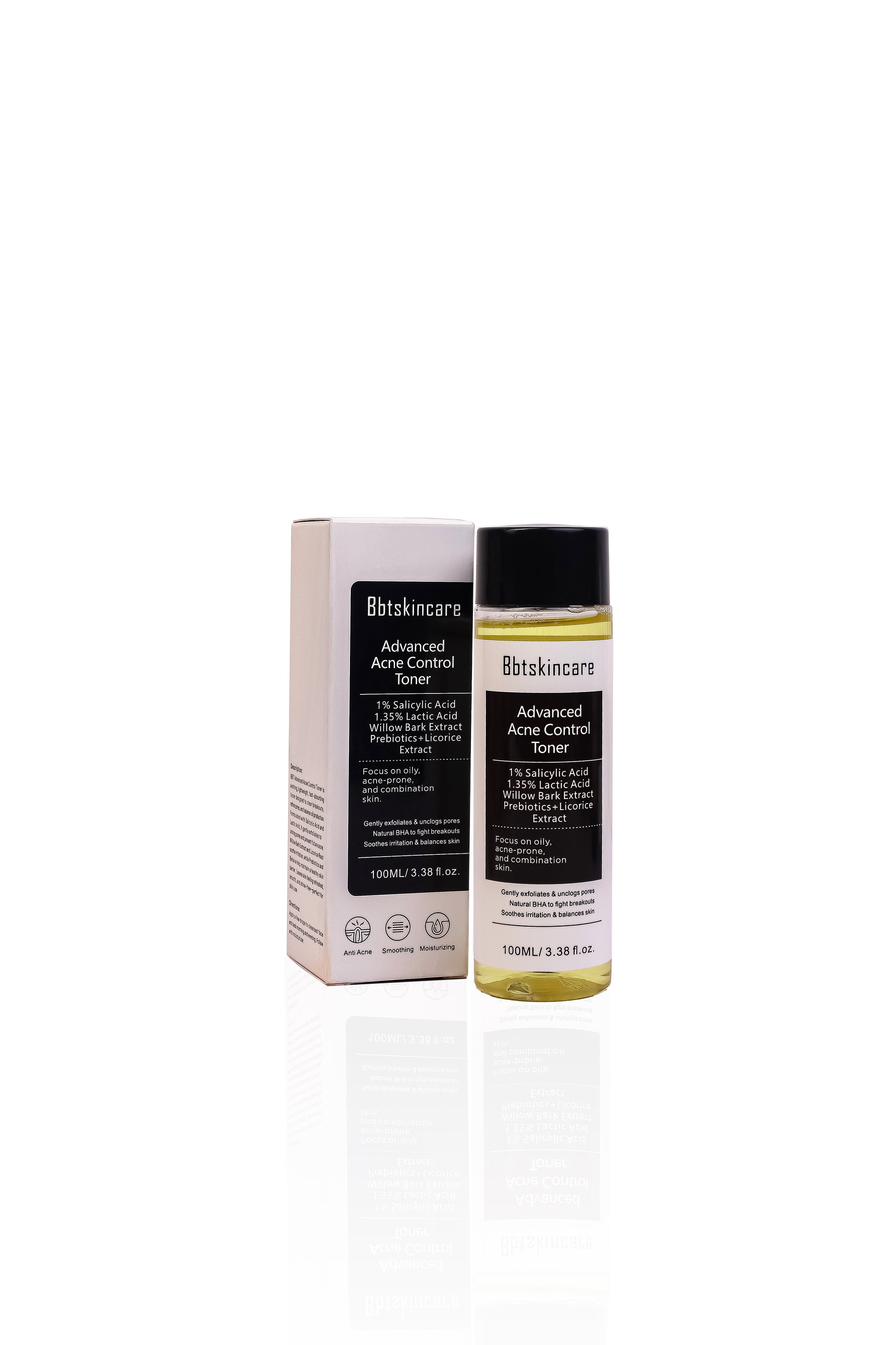 BBT Advanced Acne Control T oner is a strong, lightweight, fast-absorbing toner designed to clear breakouts, refine pores, and balance oil production. Formulated with Salicylic Acid and Lactic Acid, it gently exfoliates to unclog pores and prevent future acne. Willow Bark Extract and Licorice Root soothe irritation, while Prebiotics and Betaine help maintain a healthy skin barrier. Leaves skin feeling refreshed,smooth, and shine-free—perfect for daily use.